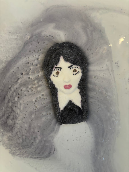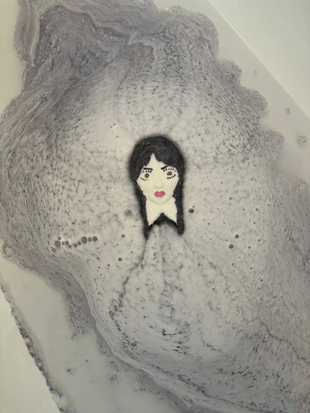 Imagine a bath bomb designed to capture the essence of Wednesday Addams. This unique creation is shaped like her iconic silhouette, complete with her trademark braided pigtails and a black dress.